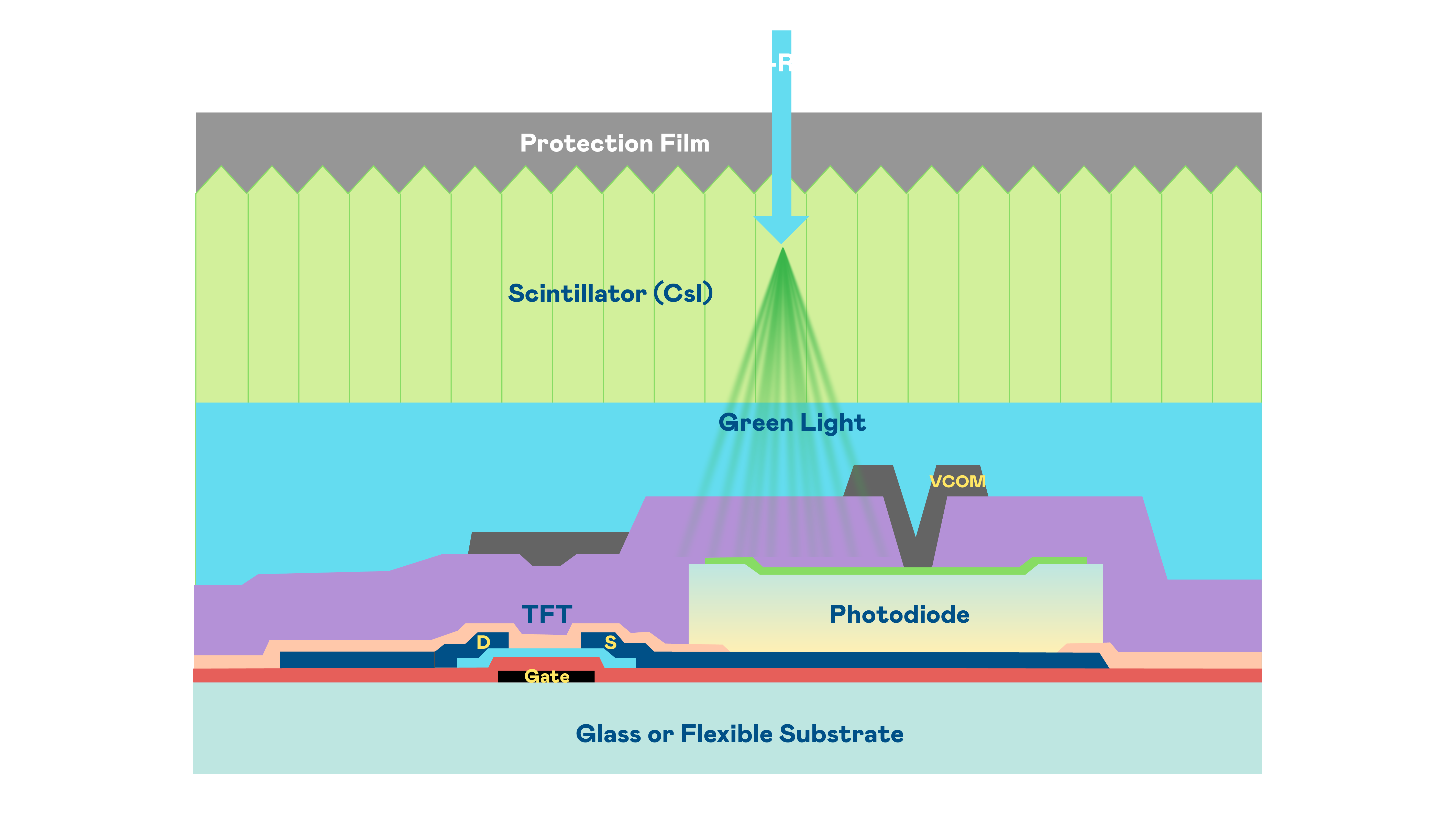 BBIN宝盈的X光影像感测阵列使用薄膜电晶体 (TFT) 作为每个像素的读取开关,搭配光电二极体(Photodiode)的光电转换元件,用以感测X光影像讯号。
